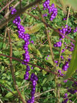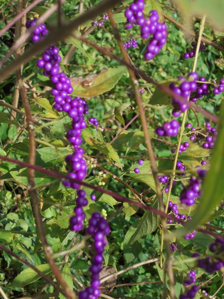 かれこれ数十年も前になるが、付近の里山から小株を引っこ抜いて来た紫式部(ムラサキシキブ)の実が綺麗に色付いて来た。仁丹大の紫の光沢のある実が細い枝にびっしりと着いている。シソ科の落葉低木で樹高は2~3mくらいになる。毎年この時期(10月末)にびっしりと付いた実が熟す。