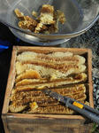昨日は隣町に住む親戚のMちゃんがやって来た。我が家の蜜箱の指導者、先生である。春からのニホンミツバチの巣箱から採蜜する要領を教えてくれるためである。半年間ほどせっせ、せっせと集めた蜜をいただくのは気の毒なことだが(4段の箱のうち)1段分を採蜜した。ハチ刺され防止のネットや採蜜用七つ道具を揃え作業にかかる。ハチミツは思ったよりは少なめだったが、残りの3段分は蜂蜜たちが冬を越すために残しておくのだという。それにしても、真夏の猛暑や梅雨の長雨、台風やスズメバチの襲来などニホンミツバチの活動も大変である。おまけに最後はごっそりと人間様に蜜を採られる。これが一番の外敵かも?知れないが(せっかくの)天然のお恵みだから有り難くいただくことにしよう。