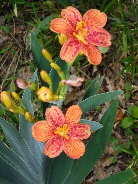 庭や裏山に植えてあるヒオウギが綺麗に咲いた。橙色に濃い赤黒斑の混じった可愛い花である。多年草で葉っぱの集合した形が扇に似ていることから「ヒオウギ」と名が付いたという。秋になると黒い仁丹大の実がなり付近に落ちて自生し増える。栽培は比較的容易である。ヒオウギ(檜扇)は7月の京都祇園祭りの時期に祭り関係者の各家の玄関や床の間で活けられると聞く。そういう意味では縁起の良い花でもある。