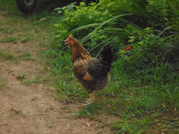 半野生になっている鶏が最近はすっかり馴れて我家に定住するようになった。古米を与えていたがそれが習慣になって早朝に裏山から下りて来る。朝の5時頃からククと啼いて餌を催促する。羽の色艶も良く近づいても逃げない。不思議なもので毎日見ていると可愛くなる。毎日鶏に餌を与えているので近頃は以前から居る2羽の家烏(イエガラス)が羨ましいのか?ニワトリを大声で威嚇するようになった。自然界も縄張り争いが熾烈である。