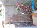 4月初めに屋敷横に置いた蜜蜂の箱に今年もミツバチが入った。温かくなってもなかなか入らないので(親戚のMちゃんが)気にかけてくれキンリョウヘン(蜜蜂蘭)の鉢を1つ置いてくれた。金稜辺はシンピジュームの仲間で中国原産の蜂が好む蘭である。蜂を寄せる力は抜群で不思議なことにその翌日から一気に蜜蜂が他所から分蜂して来た。今年も僅かでも自家製の自然な蜂蜜野味が楽しめれば良いのだが。
