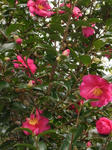 庭の南側に植えてある山茶花(さざんか)の紅色があでやかである。山茶花の花はすぐに散ってしまうが蕾が次々と開いて賑やかに咲く。咲いては散り散っては咲き花期は長い。赤系、白系、その他系と種類は豊富だ。