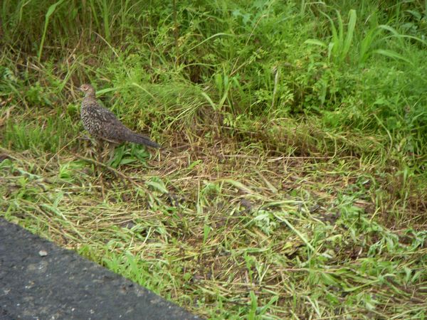 山間の農道を走っていると偶然キジの親子に遭遇する。オスは艶やかで見事な羽の模様だった。ヒナが3羽よちよち歩きで親鳥の後を追っていた。カメラに収めようと準備したが(その間に)オスとヒナは近くの茂みに隠れてしまった。幸い母親のメスのキジはカメラに収まった。比較的集落に近いこんな田んぼの中にキジが居るとは驚きである。