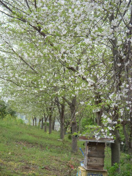 我家の裏山に植えてあるヤマザクラが咲き始めた。この桜は10年近く前に飛び込みの園芸店で激安苗(10本で千円くらい)があったので思わず飛びついて買ったものだ。一般的には山野に自生する山桜は赤系の葉が先に出て花が後から咲くのだがこの桜は違う。どちらかと言えば「大島桜」に似た品種で一般的に呼ぶところの山桜ではないようだ。それでも純白のすっきりした単純な花弁は綺麗である。植付け時は傷んでいた苗木だがすくすくと成長し結果的に良い買い物だったと思う。横に置いてあるニホンミツバチの巣にはまだ蜂が入っていないが周辺では盛んに飛び回っている。巣に入るのは今月下旬辺りになるのだろうか?
