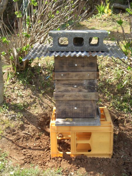 菜園で大根の播きつけをしていると菜の花、花桃、連翹(れんぎょう)などの花へ蜜蜂が群れブンブンと羽音をたてている。午後に隣町の親戚Mちゃんがニホンミツバチの様子見にやって来た。10数箱設置した巣箱にはまだ蜜蜂は入っていないが、ニホンミツバチが巣箱に入るのは4月中旬あたりだという。周りで盛んに飛んでいるニホンビツバチだがこの時期はまだ戸外のどこかでボール状に群れを成しているらしい。もうしばらくすると数匹が安心して住める箱を見付け(それを)仲間に知らせ次第に箱の中に集まるというのが習性らしい。例年、設置した箱には40%くらいの確率で蜜蜂が入るらしい。もうそろそろである。
