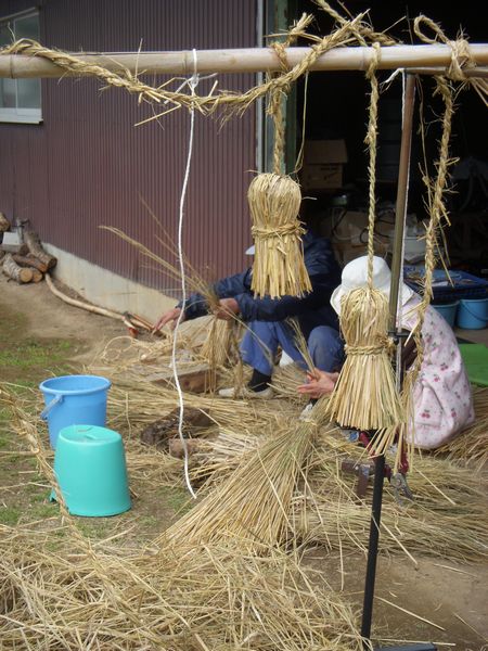注連縄づくりは結構時間がかかるものである。朝の9時から作業を始め昼食をはさんで午後の4時過ぎまでかかった。寒い日だったので納屋での作業は大変だった。注連縄の藁は糯米の藁が柔らかくて縄をなうのに適している。藁の袴をすぐったり良い束を選抜したりで悪戦苦闘の末何とか完成した。