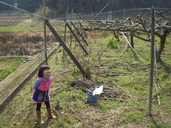遅れぎみだった無花果(イチジク)の冬季剪定がようやく終わった。剪定は1~2芽を残す「短梢剪定」という方法である。裏山の作業が結構多くて選定作業は時期的にぎりぎり状態だったので長男に手伝って貰って一気に終わった。好天だったので孫も日向ぼっこを兼ね作業中のイチジク園までやって来た。鹿や猪の防除のためフェンス際を伝ったり、タンポポ採りや農道遊び見るものすべて新鮮で楽しかったようである。