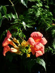 夏の花であるノウゼンカズラが次々と咲いている。濃いオレンジ色の凌霄花(ノウゼンカズラ)は中国中南部が原産地だという。蔓性の落葉樹でどんな所でも生育する。我家の凌霄花は檜の樹の下に植えてあるのだが幹にぴたりと張り付き枝から気根を伸ばし上へ上へと伸びる。開花の期間は長く9月の中下旬まで楽しめそうだ。