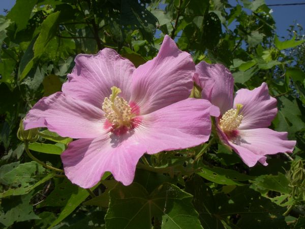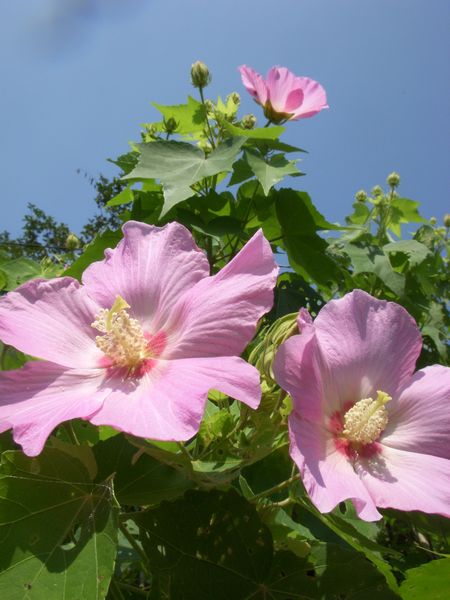 照りつける太陽の下、今年も庭の芙蓉の花が咲き始めた。アオイ科のフヨウ属に属するピンク色の綺麗な花である。蓮の花に似た形をしているので別名「木芙蓉」などとも呼ばれる。いわゆる1日花で短命、朝に咲いて夕方には萎む。お盆の前後に咲くことから諸行無常、人生のはかなさにも例えられる。