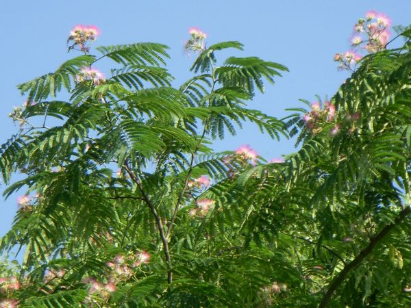 我家の裏山にも数本(大小の)合歓の木がある。さっそく裏山にのぼってみたら咲いていた。ネムノキはマメ科の高木に属する樹で根には根粒菌が着く。根粒菌は空気中からチッソを吸収する。やや湿り気のある場所を好んで植生し梅雨~盛夏の頃にかけ優しい花を咲かせる。長く糸状に伸びた雄しべは淡い紅色で繊細、ふぁふぁとした綿菓子のような花が夏のそよ風になびく。「合歓の木」の名前は夕方葉が合わさって閉じることから(眠るような状態だと)ネムノキの名が付いたらしい。真っ蒼な空とネムの優しい花のコントラストが実に美しい。