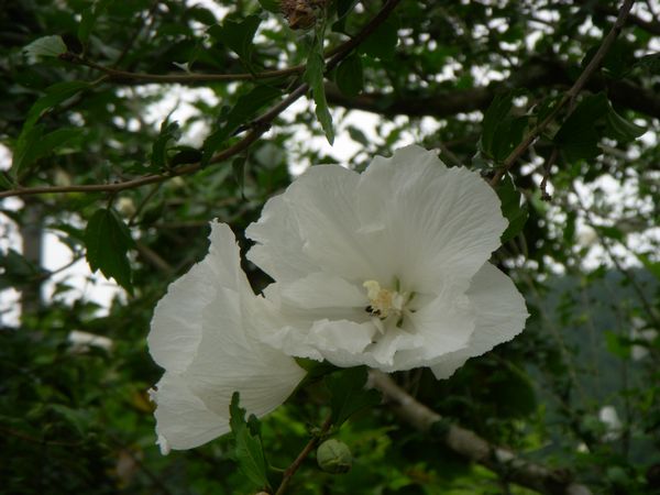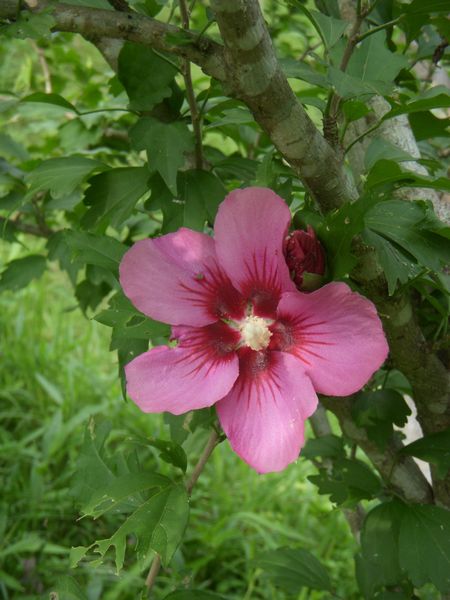 はや文月(7月)である。今年も1年の半分が過ぎこれより年の後半に入る。我家の庭に数本あるムクゲ(木槿)に花が咲き始めた。木槿(ムクゲ)の原産地は中国で日本をはじめ東南アジアの多くの地域に自生する。落葉低木(3~4m)で当地では7月初旬頃から花が咲く。韓国では木槿を「ムングフア」と呼んで国を代表する花(国花)になっている。アオイ科の仲間で花相はハイビスカスなどに似る。白、ピンク、赤系などがあり、一重から八重ものまで多種多様である。中国、韓国などでは古くより生薬として用いられ胃腸薬などの効用があるという。早朝に咲き始め夕方には萎むといういわゆる一日花であるが、枝先に次々と花を着けるので散っては咲き、咲いては散る、の繰り返しで長い期間花を楽しむことが出来る。