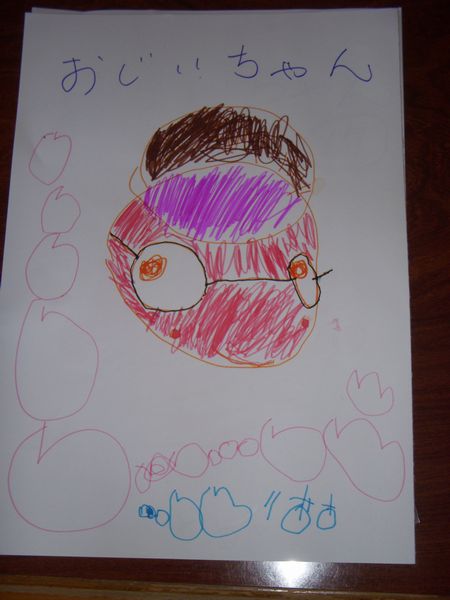 今年は孫から絵のプレゼントを貰った。まだ保育園通いの4歳になったばかりなので十分な絵は描けないが何となくジイサンの顔がイメージとして浮かんでいるのだろう。