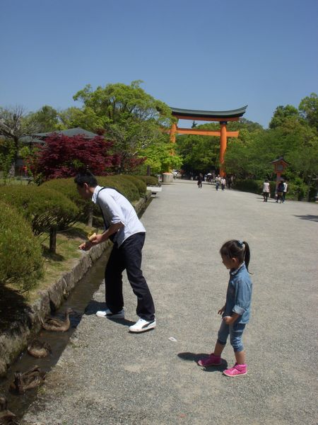 餌やりは本殿したのアプローチの宝物館付近の池や水路で出来る。茶色い小粒の餌は何か配合飼料のようなものでお菓子の紙袋に入っている。1袋100円で簡易販売されていた。それにしてもお客さんの気ままで餌が毎日振る舞われるのだから鯉も合鴨も迷惑な話である。池の鯉などの外見を見ると皆どれも肥満体である。