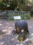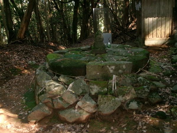 山中にはかっての山伏の坊跡、三社神社中宮、上宮、護摩壇、各種石塔など数々の修験道遺跡が残る。山頂の上宮横には立派な「宝塔」がある。禁足地になっている玉垣に囲まれて中央に立派な石の塔がある。塔身には「五智如来」が梵字で刻まれている。すなわち、大日如来(五穀豊穣)、薬師如来(病魔退散)、宝生如来(福徳財宝)、阿弥陀如来(極楽往生)を薬研彫りで刻んだものである。造立は鎌倉時代後期のものという。宝塔の前に鉄の大きな球が鎖に繋がれてあった。後日聞いた話では戦争中の魚雷ではないか?ということであった。戦勝祈願のために山上に運び込まれたものであろうか?