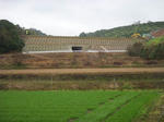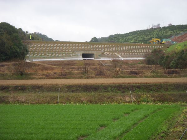 我家の田んぼから数百メートル南側に一部未開通区間の工区がある。雨の上がった後散歩方々高速道と交差する農道を歩いた。ほぼ完成形に近く高架橋や法面工事が最終段階急ピッチで進んでいる。NEXCOによればこの区間の開通予定は平成28年になるという。お金(事業費)と歳月をかければどんな工事も立派に仕上がるものである。