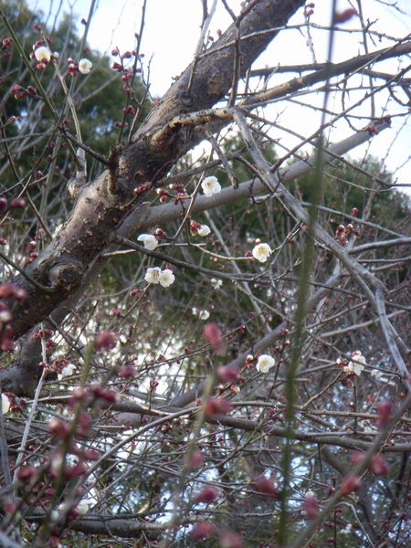 梅まつりが始まって最初の週末とあってこの日は参拝客が多く駐車場は満杯状態で付近のグラウンドが臨時の駐車場になるほどの賑わいだった。社務所横の臨時の特設会場で付近の茶道同好会の主催による抹茶をいただき3~4分咲きくらいの赤や白、緑色の梅の花を観賞した。梅まつりは3月の中旬まで楽しめるという。