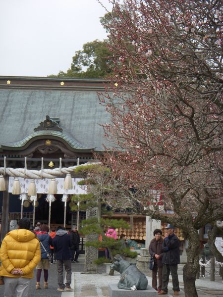 温かさに誘われ隣町にある神社で行われている「梅まつり」に出かけた。この神社は菅原道真ゆかりの神社である。遠い昔、菅原道真が大宰府に赴く際に船が嵐に遭い椎田の浜宮付近に流れ着いたという。(その時に)付近の漁師が網を敷いて道真を丁重に迎えたという。そのようなことからこの神社を綱敷天満宮と呼ぶようになったという言い伝えがある。学問の神様を祀っているだけにこの時期高校や大学の受験生が数多く訪れ絵馬などに願い事を書いて架けている。