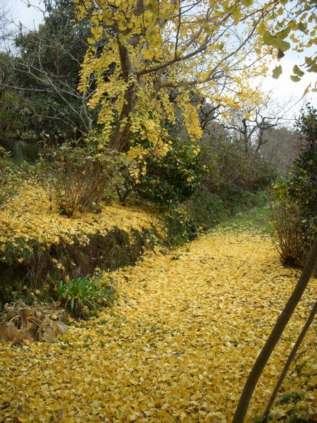 裏山の「銀杏」の葉が色付き風に舞っている。山の小途は黄金色に染まっている。黄金の絨毯とはこのことだろう。今年は出かける機会が無かったが、国東半島にある富貴寺の参道の大銀杏の樹も黄金色に染まり見事だろうと思う。イチョウの葉がひらひらと風に舞うのもあと数日である。付近に植えてある皇帝ダリアのピンクの花弁も散り始めた。明日辺りから梅の剪定作業を始めようと思っている。今年は無理にならぬよう少しずつ少しずつやろうと思う。