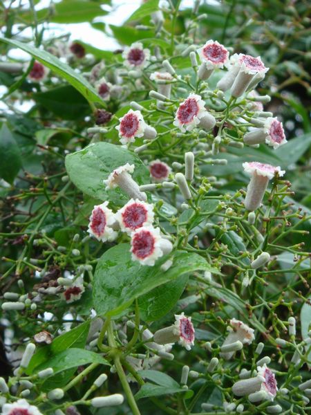 裏山のあちこちで「屁糞蔓」が伸びてそれに花が咲いている。昔から葉や茎が異臭を放つからだろうか?ヘクソカズラという有り難くない名前をいただいている。アカネ科の植物で別名をヤイトバナとかサオトメバナなどと呼ばれている。一説では悪臭を出すのは恐らく自分の身を守るため(自己防衛から)だろうと言われている。ツル性の多年草で7~9月にかけて天狗の鼻の形をした小さい花が着く。晩秋に黄色い小さな玉状の実が成る。これが地面に落ちると次々繁殖して始末に困るので早めに切り除く必要がある。