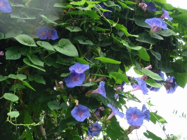 我家の前の坂附近(アプローチ)に植えてあったリュウキュウアサガオが次々に花を着けている。宿根性の琉球朝顔はヒルガオ科の花で亜熱帯性の蔓植物である。種はならずに株や挿し芽で増える。我家では数年前に小苗を買って植え付けた。今は春に芽を出して珊瑚樹とイヌビワの樹に伸び放題に這わせている。オーシャンブルーの真っ青な花は夏が良く似合うが、(実際には)6月頃から咲き始め晩霜の頃(11月)まで咲いては散り散っては咲く息の長い花である。