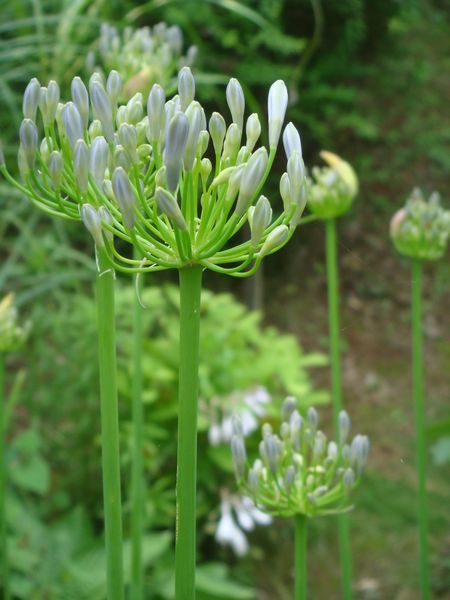 梅雨時(6月~7月)に開く花「アガパンサス」が庭や裏山でぽつぽつ咲き始めた。南アフリカ原産になる多年草のアガパンサスは日本名でムラサキクンシランなどと呼ばれる。南国生まれ、育ちながら結構耐寒性もある。緑の纏まった葉の群れの中から花茎がすーっと長く伸び先端に人が拳を広げかけたような形で花が咲く。花茎の丈は1~1.5mくらいにもなる。幾種類か花の色があるが青紫色のが一般的でびっしりラッパ型の花を着ける。
