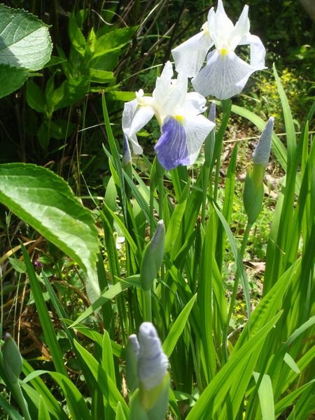 ここのところの夏日続きで庭の一角に植えてある「菖蒲」が咲いた。ちょうど朝方隣家のAさんが咲き始めたショウブ2種(淡い白紫と濃い紫)を切り花で持参してくれた。色の濃い艶やかな方は後日株分けしてくれるという。