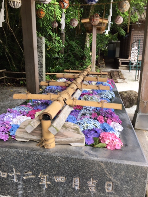 数日して、どんな具合だろうか?と夫婦で神社に参拝方々見に出かけた。なかなか綺麗に飾ってあった。拝殿前にはショウブ(菖蒲)の鉢も置いてあり、6月限定のアジサイ御朱印なども発行していた。最近はSNSで発信をされたり、カメラに収めたりと様々楽しむ方がいる。思わぬところで我家のアジサイが役に立っている。近々、NPO法人S学園の写真部が撮影にやって来る予定である。
