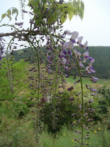 裏山の櫨(ハゼ)の木に伝わせている山藤(ヤマフジ)がぼつぼつ咲き始めた。亡くなったおふくろ(母親)の実家の庭にあったという白藤(シロフジ)の方の開花はまだである。この白藤は実は従姉妹の家に植えてあって先年その穂木を譲ってくれたものである。品種名は分からないので母親の実家の性を取って「浅井の藤」と自分で勝手に命名し名札を付けている。私にとっては大切な藤の樹である。残念なことに現在膝関節のリハビリ中なので急な坂道歩きを自重している。写真は連れ合いが気を利かせ撮ってくれた。裏山中腹からのアングルは向こうの谷の雑木林も望めなかなか良い。