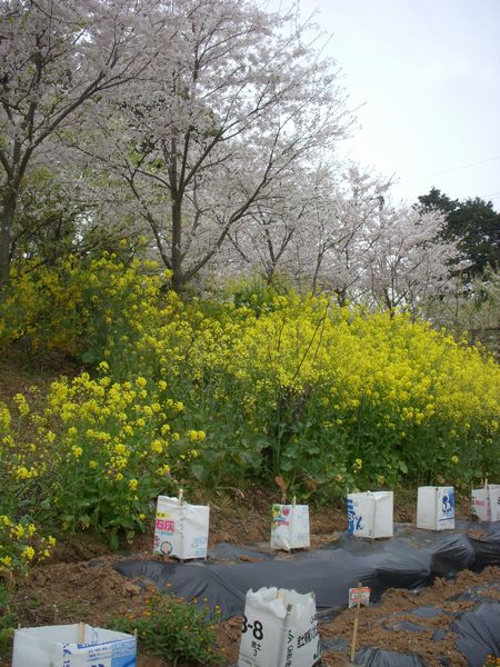 昨夜~今日の未明、朝方は少し雨が降った。数日前から少しずつ南瓜(カボチャ)苗を圃場に移植しているのでちょうど良い潤いだった。今移植している育成苗(ポット)はビニールトンネルで育てた岐阜長南瓜の宿儺(スクナ)、ロロン、鉄かぶとなどである。後半育成分はほっこり南瓜などで中旬以降になる。周辺では菜の花、連翹(レンギョウ)、桜(ソメイヨシノ)が咲き誇っている。カボチャ移植の後に肥料袋を2つに切って囲ったビニールは防寒と防風のダブル効果をねらったものである。
