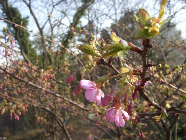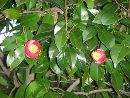 家裏の木漏れ日林に自生している藪椿(ヤブツバキ)が咲き始めている。吸蜜のためメジロが時折やって来る。ツバキは東北地方~九州沖縄にかけ照葉樹林帯を中心に育つ冬の花である。樹高は樹齢を経ると10m近くにもなる。花の大きさは5cmくらい。色は赤(五弁花)で中は黄色である。