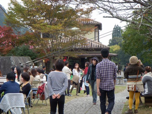 山国川の源流にあたるという猿飛甌穴群の会場ではマイクロバス(2台)で男女の若者交流会があっていた。後でパンフレットを見たら「かかし婚」という出会いを提供する町の企画だった。紅葉を愛で、案山子に微笑みかけながらの婚活でよきカップルが誕生しただろうか?