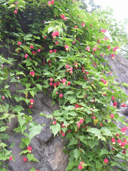我家の前の石垣に沿って植えてある「浮釣木」の花が次々咲いている。花期は長く3月~9月と楽しめる。熱帯性の植物だと言うが…気温が10℃以上だと冬でも花を着けるらしい。アオイ科の植物でウキツリボクの名称のほか別名チロリアンランプとかアブチロンの仲間として単にアブチロンなどとも呼ばれる。釣のウキに似ている花の姿は可愛くて赤と黄色のコントラストがきれいである。