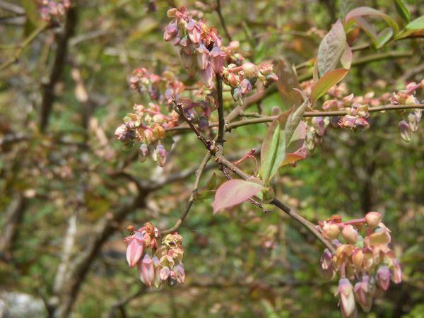 裏山のブルーベリ園で花が満開になっている。品種によって花の色や形が微妙に違う。4月に花が咲いて実は7、8月頃に黒く(赤系もあるが)熟す。