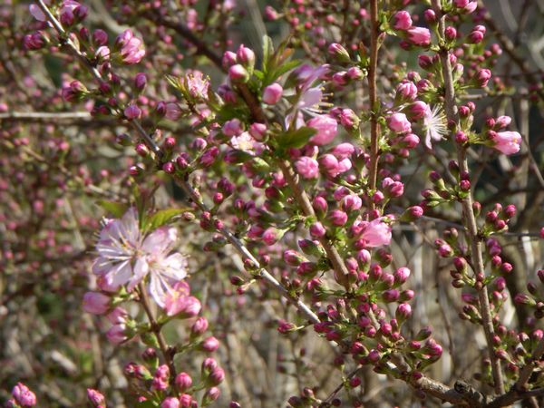 屋敷横の「庭梅」が今を盛りに咲いている。中国原産の落葉低木は樹高は1~2m程度である。春のこの時期淡紅色の小さい花がびっしりと着く。果実は7月頃に1cmくらいと小粒で赤く熟れる。そのままでも食べられるが果実酒などにも用いられる。当地では庭梅のことをユスラウメと呼ぶことが多い。