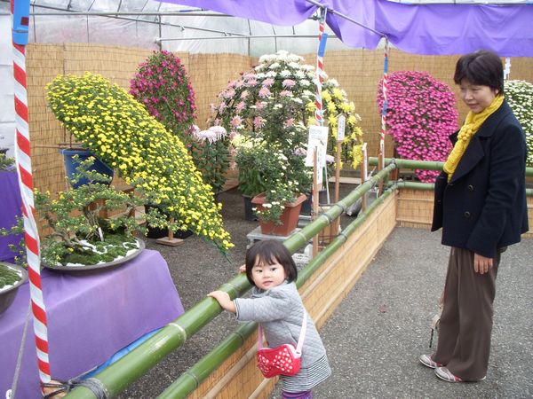菊の手入れは通年かけて行うものらしく根気のいる作業で高齢者の趣味が多いらしいのだが…最近はどんどん高齢化が進んで出品点数が少しずつ減っているらしい。だがここの展示はどうしてどうして大変見応えがある嗜好だった。聞けば菊づくりは手先が器用でないとうまく行かないらしく…手が震えると良い作品が出来ないという。盆栽風仕立て、扇の形をした仕立て、1本仕立てなど様々なものが工夫を凝らし展示されていた。初めての菊の花と会場の雰囲気に孫もいたってご満悦の様子だった。菊鑑賞の後は双葉山を顕彰する記念館売店でお茶をよばれお土産を買って帰る。