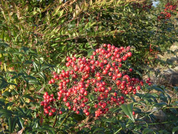 またナンテンは山野(里山)や深山の麓などでもしばしば見かける。これはヒヨドリなどの野鳥が種を食べ糞をあちこちに散らかすためで、天道生えで繁殖するのである。これも南天の樹の知恵であろうか?赤い実は昔から生薬として用いられている。葉っぱは防腐効果があることから魚料理や赤飯などに乗せて出されることが多い。昔の人の生活の知恵である。