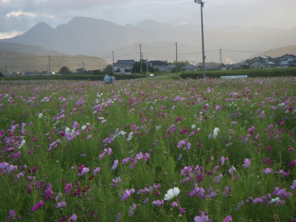 夕方、隣町にある大ノ瀬官衙(ダイノセカンガ)遺跡を訪ねた。道の駅に隣接している公園のコスモス畑が見頃になっている。遺跡公園は長男のアパートに行く途中にある。マイカーでのお客さん、子供連れが多いようだ。公園からは豊前の屏風、山並みが遠望出来る。経読岳、松尾山、雁股山、求菩提山などを従え、福岡県で2番目の高峰である犬ケ岳が雄大に聳える。ちょうど西の端に夕陽が傾いていた。秋の日はつるべ落としという。もう半袖では少し肌寒い時節になった。