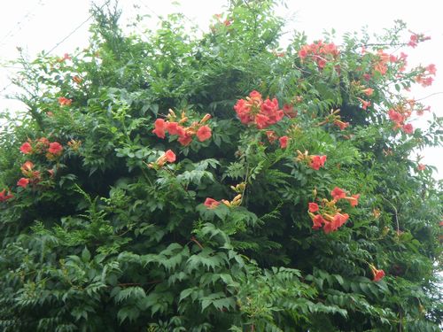庭の檜が満開状態になっている。と言っても…今頃に檜へ花が咲くわけはなく…勢いよく幹を伝っている「ノウゼンカズラ」の花が一斉に咲き乱れているのだ。ここ1~2ケ月にわたり次から次へと咲いては散り、散っては咲いている。そろそろ花期も終わる頃なのだが…