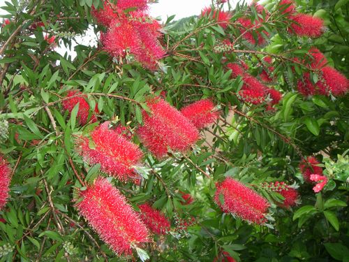 庭の金鳳樹(金宝樹とも呼ぶ)の花が今を盛りに咲いている。別名ブラシの木とも呼ぶこの樹は原産地がオーストラリアだという。ふともも科の常緑小高木で背丈は年数を経たもので3mくらいになる。英名を「ボトルブラッシュ」と言うらしい。これば瓶にブラシを差し込んで洗っている姿に似ているからだという。