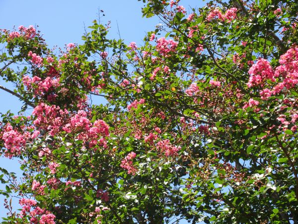 庭の「百日紅」の花が咲いている。サルスベリと読む。夏~秋にかけて咲く花である。朱色でビッシリと枝先に花が着く。淡い紫系や白系の花を着ける品種もある。猿滑と書いている本もある。夏~秋にかけ長期に花が咲くことから百日紅と表現するのだそうだ。すべすべした幹肌で猿も木に登れないくらいにすべすべしているところからこの名が付いたらしい。なるほどと思う。中国南部原産の樹で樹高4m~5mとそう高くはならない。