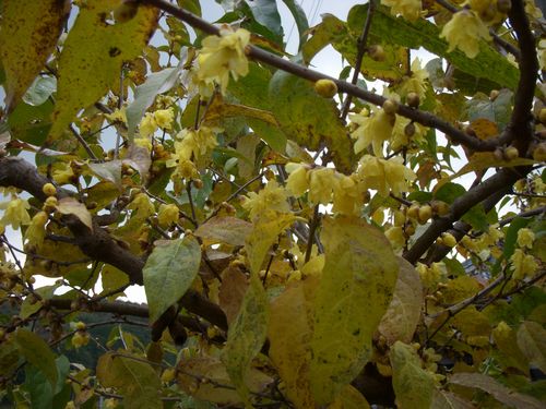 今年もあと10日余りになった。気圧配置は西高東低、冬将軍の訪れも近い。寒さの襲来とともに裏山の「ロウバイ」に花が次々咲き始めた。蝋梅は近くを通ると芳香を放つのですぐにそれと分かる。この黄色い蝋のような花は正月を中心に2、3月頃まで楽しませてくれる。黄色に色付いた枯れ葉も風情を誘う。
