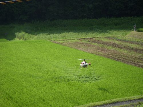 今日はJAによる無人ヘリコプターの水稲航空防除実施。一昔前まで農家では皆(それぞれが)重たい動力噴霧器を肩に背負って行ったものだ。最近はラジコンヘリで低空から病害虫駆除を行う。昨年まで近所のEさんは奥さん相手で自分で(個人防除を)やっていたが…ついに今年は皆さんと同様にJAへ依頼した。そろそろ体力の限界を感じたのか?これも時代の流れというものだろう。高齢化で農家は70歳代が多勢を占めている。