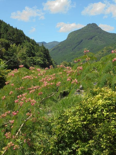 久しぶりに求菩提山麓を車で走った。道中、ちょうどこの時期に咲く合歓の木(ネムノキ)があちこちで咲いていた。県道のガード越しに求菩提山をバックにネムノキをデジカメに収めた。優しく淡いピンクの花と山の緑の濃さが目に染みた。合歓木が散ればいよいよ猛暑の夏がやって来る。
