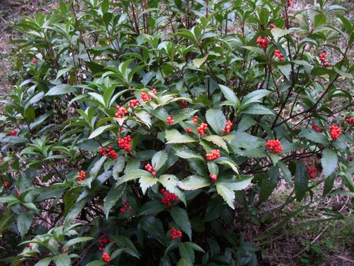 離れ裏に植えてある「センリョウ」に真っ赤な実が着いている。「千両」はセンリョウ科の植物で東アジア~インドにかけて広く分布する。常緑の小低木で日本では関東以西に育ち(お正月用の)縁起物として飾られる。我が家にも数本植えてあるが(写真のものは)隣組のTさんから分けて貰ったものである。移植後5、6年になるが(2、3年前から)毎年立派な実を着けている。花瓶などに挿すとずいぶんと長持ちのする重宝な花である。