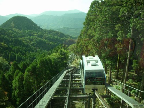 ここからはスロープカー(ケーブルカーがレールに乗って動くような乗り物)で英彦山神宮まで通じている。スロープカーの所要時間は片道20分くらい、往復キップ料金は2人で1,200円だった。国定公園内の大自然の中の近代的な施設には少し違和感があったが、建設当時は景観条例とか、環境面などでいろいろと物議があったのではないか?と察せられるけれど(軌道施設の是非はともかく)足腰の弱いお年寄りから子供までが気軽に神社まで簡単に登って来れるようになったので観光客増に繋がっているようだ。紅葉がようやく始まったこの時期だったが…域内は大勢の観光客で賑わっていた。登山者はさらにこの神社裏を通り1時間半ほどで山頂に到達する。もう数十年も前になるが一度山頂に立ったことがあるけれど…(ピーク付近の様子は)今はあまり記憶に残っていない。