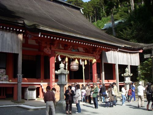 紅葉の盛りにはまだ少し早かったものの(九十いくつかあるという)ヘアピンカーブですれ違う車は多かった。この日、神社周辺では「収穫イベント」や修験者による「大護摩焚き」などが行われていたようだ。神社社務所で安産お守りを、スロープカー駅では煎餅、名水などを買い求めた。