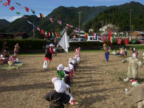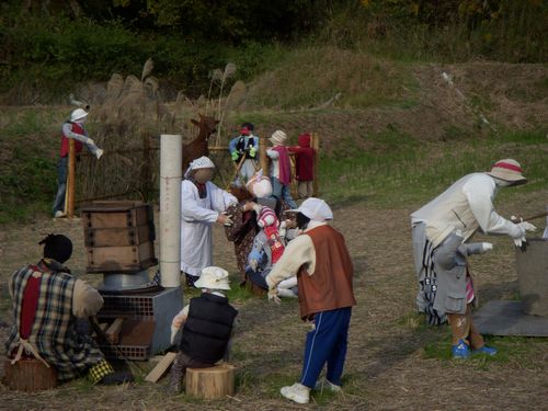 過日、山国の「かかし祭り」を見に出かけた。国道496線沿いの「てらおの村」の田んぼではかかし達による「餅搗き」を再現していた。リアル感のあるユーモラスな格好に思わず笑ってしまい(つい)デジカメのスイッチを押してしまった。