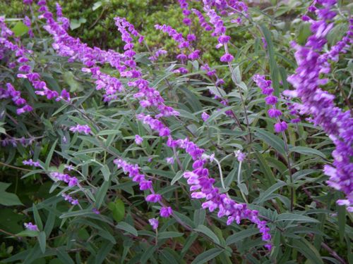 庭の「メキシカンブッシュセージ」が満開である。ハーブの一種らしく葉を折ってみると香りが良い。花の形は「虎の尾」に似ている。紫の房状の花は10月上旬~11月上旬にかけて咲く。横の皇帝ダリアがぐんぐんと伸び風に靡いている。