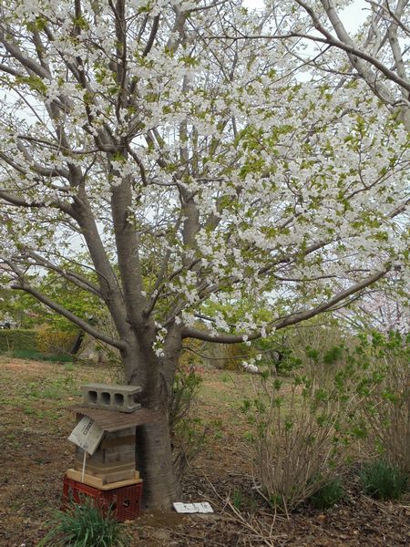 大島桜(オオシマザクラ)は野生種に近い桜で、別名、薪桜とか餅桜とか呼ばれている。樹高は高く20m近くにもなり、樹質は硬く薪として使えることから「薪桜」の名が付いたという。また「餅桜」の名が付いたのは(オオシマザクラの葉は)さくら餅を包む葉だからという。軟らかく大きな葉である。花の色は純白で、わずかに芳香がする。今年はオオシマザクラの下にニホンミツバチの巣箱を置いた。間もなく日本蜜蜂の分蜂が始まる。金陵辺(蜂蜜蘭)の花を置いてうまく蜂が箱に入ってくれれば良いのだが。