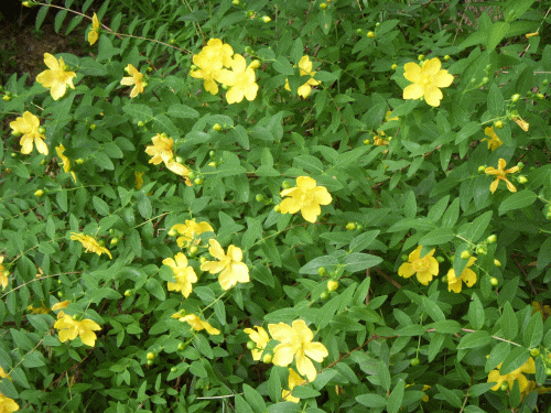 金糸梅はオトギリソウ科の半落葉低木であるが(暖かい地方なら)落葉しない。原産地は中国で江戸時代に日本へ渡来した植物だという。樹高は1mくらいで道路(植え込み)での植栽や庭の場塞ぎとして良く用いられるようだ。梅雨頃に沢山の黄金色の花(直径4cmくらい)を着ける。欲を言えば、この花は雨に濡れた方が趣があるのだが…、今年は入梅が遅れている。
